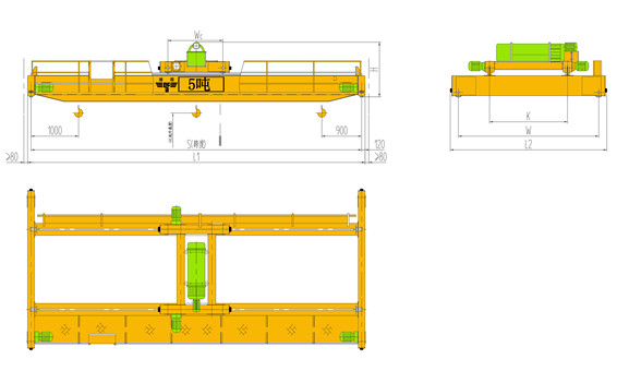 例:起重量:主鉤5t,副鉤5t,跨度:22.5m,起升高度9m,工作級別A6,開式操縱室操縱